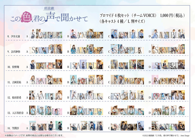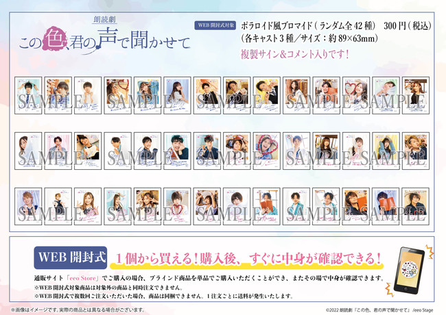 集めて飾りたくなるブロマイドや缶バッジの他、朗読劇『この色、君の声で聞かせて』の魅力がギュッと詰まった公演パンフレットや朗読台本などのグッズも登場!