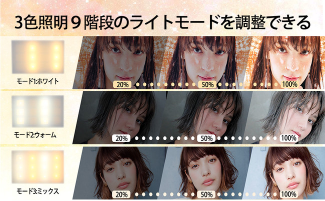 自撮り棒は先端のホルダー部分には3色×9 段階調光(3色:ホワイト、ウォーム、ミックス;9 段階調光:弱、中、強),照明のニーズに応じて、さまざまな照明を使用できます。