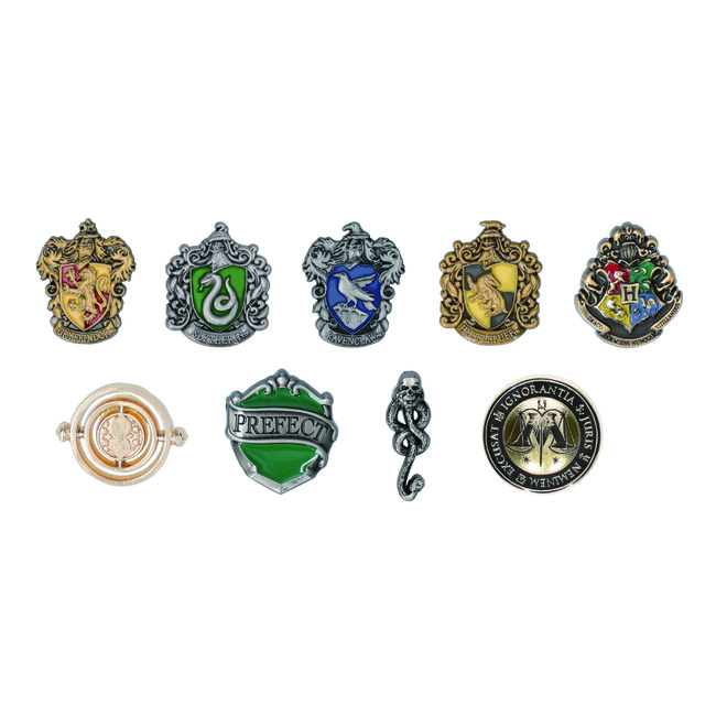 ホグワーツとグリフィンドール、スリザリン、レイブンクロー、ハッフルパフの4寮の紋章はもちろん、闇の印やイギリス魔法省、スリザリンの監督生バッジなどもラインアップに含まれています。