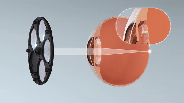 8個の光学レンズが5分間60回、回転しながら目の毛様体筋を刺激します。