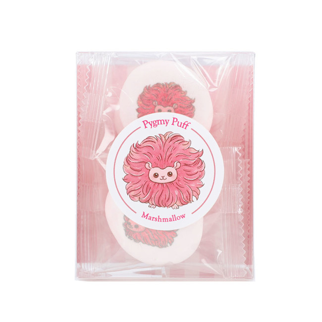 さらに、愛らしい魔法動物のピグミーパフをふわふわのマシュマロで表現した「ピグミーパフ マシュマロ」は、丸い形がまるで本物のピグミーパフのよう。食べるのがためらわれるほど愛らしいマシュマロは淡いピンクのいちご味で6個入りとなり、おみやげなどのギフトにもぴったりです。