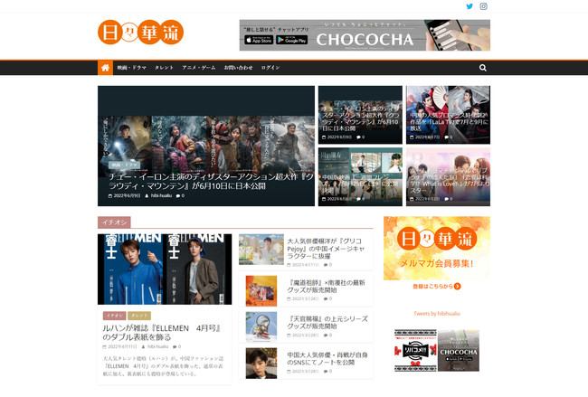 コロナ禍を経て、ようやく海外渡航の再開も現実味を帯びてきた今、海外エンタメとの交流はますます活発になり、日本と中国の相互の文化交流も今まで以上に盛んになることが予想されます。『日々華流』では、中国の人気タレントの動向や映画、ドラマ、アニメ、ゲームの最新情報、日本での放送予定など、華流に関するさまざまな情報を発信。日本初の本格“華流”特化メディア『日々華流』にぜひご注目ください。