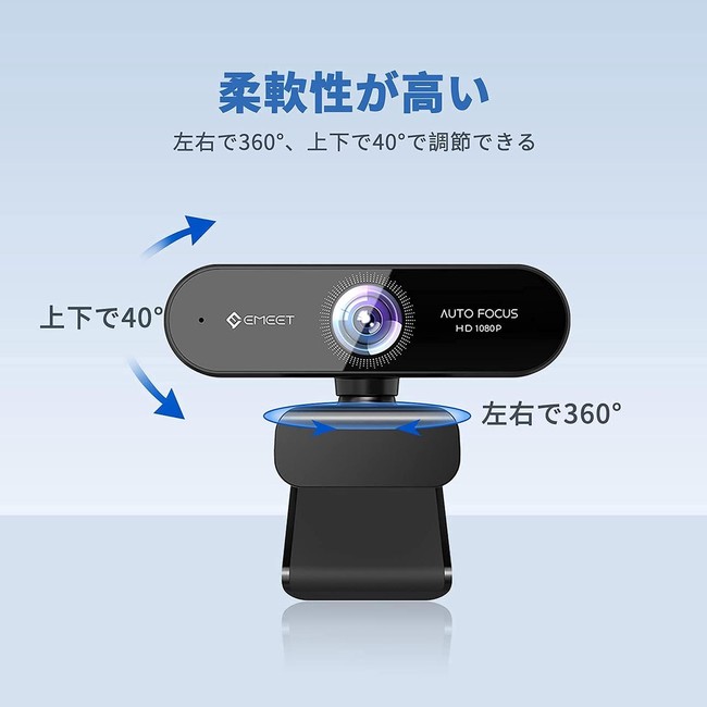 自由に動くカメラが特徴。左右360°、上下40°で調節でき、全方位の撮影ができます。折り畳み式のコンパクトサイズの軽量なウェブカメラで、収納や外出先への持ち出しに便利です。