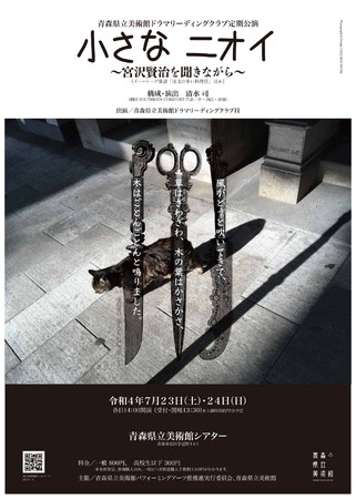 青森県立美術館パフォーミングアーツ推進実行委員会、青森県立美術館主催、令和4年度青森県立美術館ドラマリーディングクラブ定期公演『小さな ニオイ 〜宮沢賢治を聞きながら〜』が令和4年7月23日(土)/7月24日(日)に青森県立美術館シアター(青森県青森市安田字近野185)にて上演されます。 チケットはカンフェティ(運営:ロングランプランニング株式会社、東京都新宿区、代表取締役:榑松 大剛)にて6月20日(月)10:00より発売開始です。