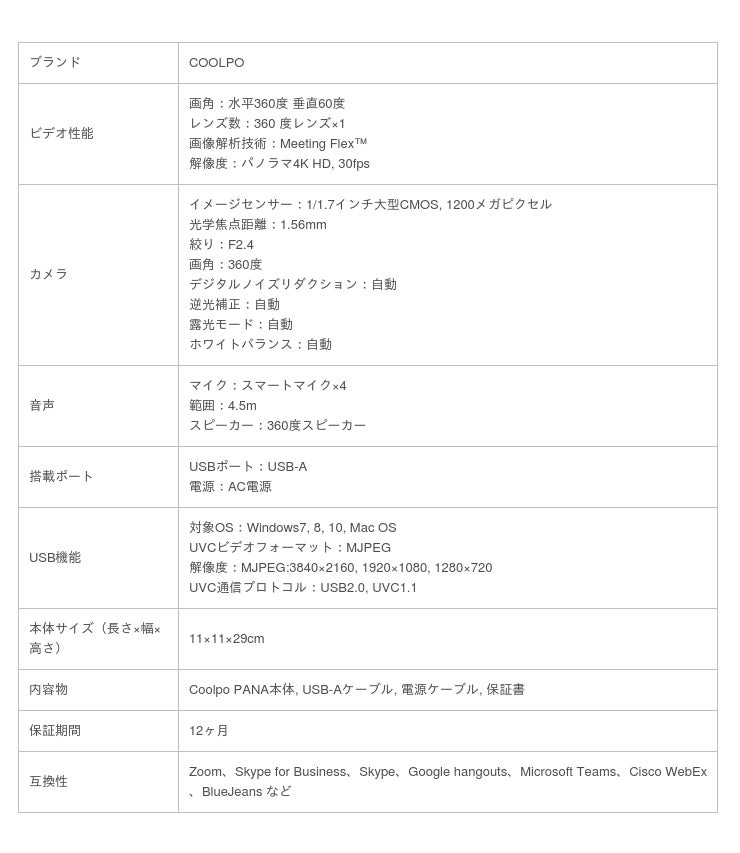 Coolpo AI Huddle 会議用ウェブカメラは、カメラ、マイクとスピーカーが搭載され、1台でweb会議に必要な機材が揃います。360°カメラで会議室全体を映し、4つのマイクは最大半径4.6メートルの音を認識可能です。