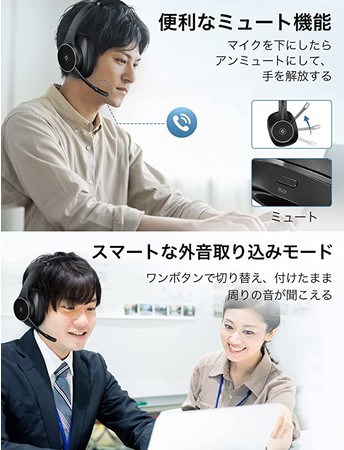 EMEETヘッドフォンHS150は、マイクを上にしたらオン、下にしたらミュートを解除する使い勝手がよいミュート機能が付き、手間がかからない。それに、左側のlogoを押すと外音取り込みモードに切り替え、ヘッドセットを付けたままでも周りの音が聞こえるため、ヘッドセットを外さずに、仕事同士と話せる。