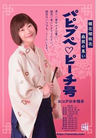 桃花らくご制作委員会企画制作、蝶花楼桃花 贔屓の集い「パピプペ(ハート)ピーチ号」が2022年7月11日(月)から2023年6月12日(月)まで、お江戸日本橋亭(東京都中央区)にて全10回開催されます。6月28日(火)にはプレビュー公演として第0回が開催され、満員札止めの盛況となりました。 チケットはカンフェティ(運営:ロングランプランニング株式会社、東京都新宿区、代表取締役:榑松 大剛)にて発売されます。