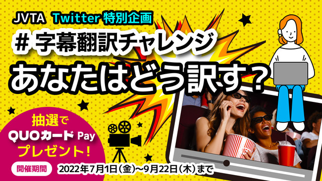映像翻訳者を育成する日本映像翻訳アカデミー株式会社(本社:東京都中央区、代表取締役:新楽直樹、以下「JVTA」)は、公式Twitter(@JVTA_TOKYO)にてオリジナルの字幕を考えて投稿してもらう参加型企画「〜あなたはどう訳す?〜 #字幕翻訳チャレンジ」を、2022年7月1日(金)から2022年9月22日(木)まで実施いたします。
