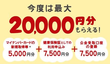 マイナポイントを申し込む際、決済サービスに「nimoca」を選択した場合、健康保険証としての利用申込みと公金受取口座の登録でそれぞれ7,500円相当の「nimocaポイント」が付与され、これまで実施しているマイナンバーカードを新規に取得した方への最大5,000円相当と合わせると最大20,000円相当の「nimocaポイント」を付与いたします。