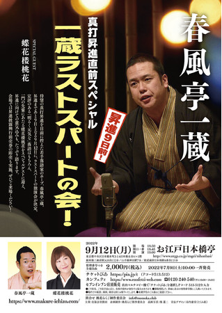桃花らくご制作委員会企画制作、真打昇進直前スペシャル 春風亭一蔵「一蔵ラストスパートの会!」〜special guest 蝶花楼桃花〜が2022年9月12日 (月)にお江戸日本橋亭(東京都中央区日本橋本町3-1-6日本橋永谷ビル1階)にて開催されます。 チケットはカンフェティ(運営:ロングランプランニング株式会社、東京都新宿区、代表取締役:榑松 大剛)にて7月9日(土)10:00より発売開始です。