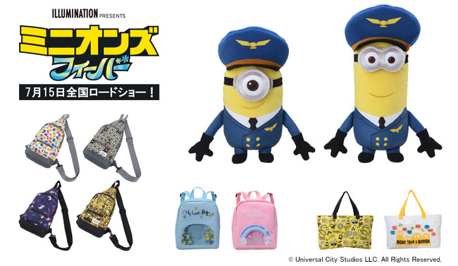 劇中に登場するパイロット姿の「ケビン」、「スチュアート」の「ミニオンズ フィーバー スペシャルパイロットぬいぐるみ」や、「ミニオンズ」がデザインされたリュック・バッグ8種と、子どもから大人まで楽しめるラインナップとなっています。