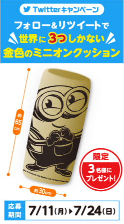 モーリーファンタジー公式Twitterをフォローし、指定ツイートをリツイートしていただいた方の中から抽選で3名さまに世界に3つしかない『金色のミニオンクッション』をプレゼントいたします。詳細は公式Twitterをご確認ください。