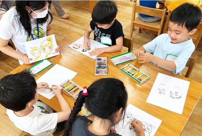 紙芝居で学んだあとは、家族の似顔絵を描いていきました。最初は、輪郭に目と口だけ描いていた子も、紙芝居を思い出して「あ!髪の毛がない!」と気付き、学んだことを活かしてお絵描きをしていました。