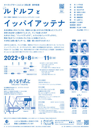 オペラシアターこんにゃく座(神奈川県川崎市)主催、オペラ『ルドルフとイッパイアッテナ』が2022年9月8日 (木) 〜2022年9月11日 (日)にあうるすぽっと(東京都豊島区東池袋4-5-2ライズアリ-ナビル2F・3F)にて上演されます。 チケットはカンフェティ(運営:ロングランプランニング株式会社、東京都新宿区、代表取締役:榑松 大剛)にて発売中です。
