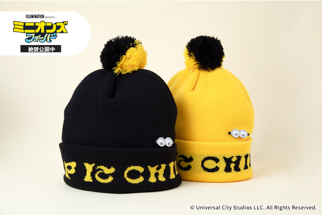 お茶目なミニオンたちのイメージにぴったりなかわいらしいフォルムに、ミニオンらしいユルいメッセージ「KEEP IT CHILL」の文字が映えるニットキャップ。ボディの色合いに合わせて、バイカラーに仕上げたポンポンがデザインポイントです。