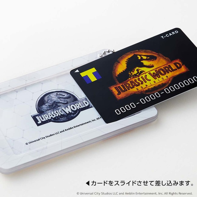 また、「Tカード(ジュラシック・ワールド)」公式サイトや、全国のTSUTAYA・旭屋書店では、カードの持ち運びに便利なスライドカードケースの予約受注販売も行います。表面はオシャレなグレーの作品ロゴ、裏面には迫力満点のギガノトサウルスとティラノサウルスをあしらったデザインです。