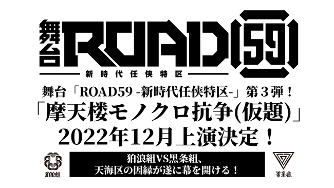 舞台「ROAD59 -新時代任侠特区-」第3弾「摩天楼モノクロ抗争(仮題)」2022年12月上演決定!2022年12月に舞台第3弾となる『舞台「ROAD59 -新時代任侠特区-」摩天楼モノクロ抗争(仮題)』の上演が決定しました!