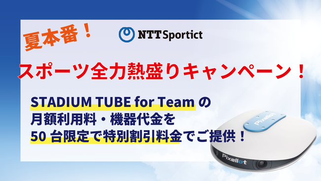 AIスポーツ映像ソリューション「STADIUM TUBE」を提供する株式会社NTTSportict(本社:大阪市都島区、 代表取締役社長:中村正敏、以下NTTSportict)は、動画を用いたチーム強化や、関係者に向けた選手の活躍の配信をご検討されている方々を対象とした、可搬式スポーツAIカメラ「STADIUM TUBE for Team」を提供しています。 このたび先着50台に限り、初期費用もしくは月額料金を特別価格でご提供する割引キャンペーン「夏本番!スポーツ全力熱盛りキャンペーン!」を実施いたします。