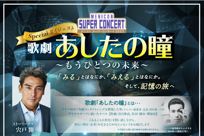株式会社メニコン(本社:名古屋市中区葵三丁目21-19、代表執行役社長:田中英成)は、2022年10月7日(金)にメニコンスーパーコンサート2022 歌劇「あしたの瞳〜もうひとつの未来〜」ダイジェスト演奏会を宮崎のメディキット県民文化センター演劇ホールにて上演いたします。また、この公演に400名様をご招待いたします。