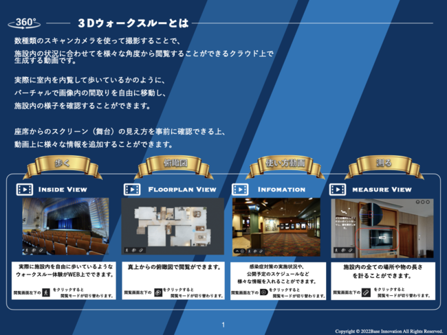 株式会社Base Innovation(本社:東京都港区、代表取締役:鈴木 隆太)は劇場・映画館などで事前に予約前に客席から舞台・スクリーンの見え方を確認できるツールとして弊社制作の「3Dウォークスルー動画」を劇場・映画館向けに特化し、実証実験協力企業及び導入企業の募集を開始します。
