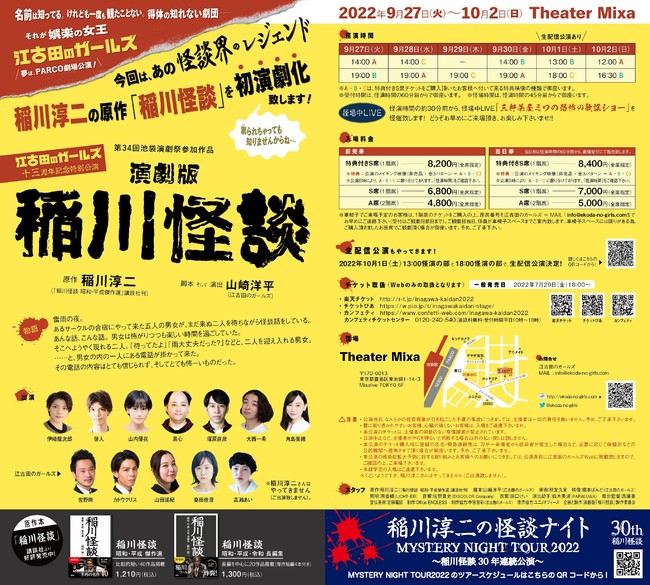 江古田のガールズ十三周年記念 特別公演 演劇版「稲川怪談」が2022年9月27日(火)〜10月2日(日)にTheater Mixa(東京都豊島区)にて上演されます。チケットはカンフェティ(運営:ロングランプランニング株式会社、東京都新宿区、代表取締役:榑松 大剛)にて7月29日(金)より発売開始です。