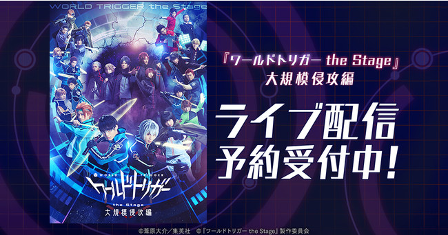 合同会社DMM.com(本社:東京都港区、会長 兼 CEO:亀山敬司 以下「DMM」)は『ワールドトリガー the Stage』大規模侵攻編の2022年8月6日(土)12:30/17:30東京公演、8月21日(日)12:30/17:30京都公演のライブ配信・アーカイブ配信いたします。ライブ配信は公演終了後も楽しめるディレイ配信(見逃し配信)付きです。ご自宅や外出先のパソコン、スマートフォン、テレビ画面でお楽しみください。 また、各公演終了後の翌日から、玉狛支部メンバーのキャスト7名による配信限定の特典映像2種も配信いたします。