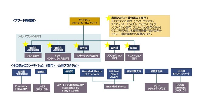 映画祭では、東京をテーマにした作品を募集する「Cinematic Tokyo部門」、クリエイターの表現の幅とチャレンジの機会をさらに広げ、スマートフォンならではの新しい映像クリエイティブの創出を目的にソニーがサポートする「スマートフォン 映画作品部門 supported by Sony's Xperia™」、国内の25歳までの監督が制作した作品を対象に、5分以下のショートフィルムを募集する「U-25プロジェクト」、企業・行政によるブランデッドムービーを特集する「BRANDED SHORTS」といった多岐にわたる作品公募も同時スタート。
