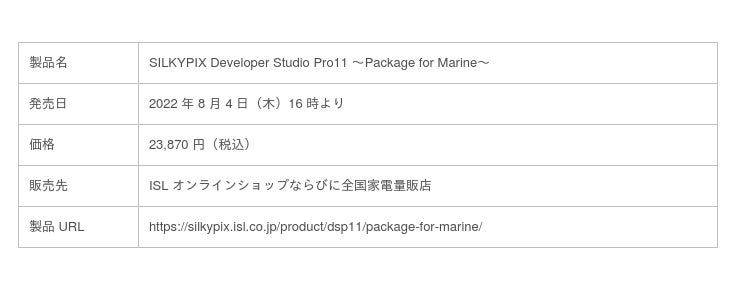 ※『SILKYPIX Developer Studio Pro11〜Package for Marine〜』に収録のソフトウェアは、現在販売中の『SILKYPIX Developer Studio Pro11』と同じものです。