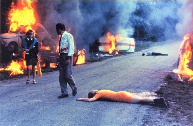 パリに住むロランとコリンヌのブルジョワ夫婦は、田舎にある妻の実家へ向かうため週末に車で旅に出る。共に愛人がいる2人は、死にかけているコリンヌの父から遺産を相続してからパートナーをどう殺害しようかと企んでいた。2人を乗せた車は都心部から郊外に出るが、交通渋滞に巻き込まれてしまう。まったく前に進めないイライラから人々は集団ヒステリー状態に陥り、2人は信じられない事件や事故に遭遇していく。