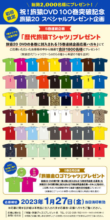 抽選で合計1800名様にプレゼント!(旅猿歴代Tシャツ01〜54の54種から希望の1種を選択)