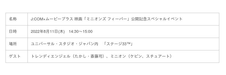 JCOM株式会社(J:COM、本社:東京都千代田区、代表取締役社長:岩木陽一)と映画専門チャンネル「ムービープラス」を運営するジュピターエンタテインメント株式会社 (本社: 東京都千代田区、代表取締役社長: 林田真由)は共同で、『ミニオン・パーク』5周年を記念し、イルミネーションの最新作『ミニオンズ フィーバー』(7月15日(金)公開)に登場する、カンフースーツのミニオンたちが繰り広げるまさにNO LIMIT!なハチャメチャエンタテインメントが、期間限定で登場しているユニバーサル・スタジオ・ジャパンで、<J:COM×ムービープラス 映画「ミニオンズ フィーバー」公開記念スペシャルイベントatユニバーサル・スタジオ・ジャパン!>を2022年8月11日(木・祝)にJ:COM加入者300名を招待して開催しました。