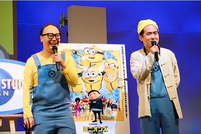 現在大ヒット上映中の映画『ミニオンズ フィーバー』の公開も記念した本イベントでは、幅広い年代に大人気のお笑い芸人“トレンディエンジェル”が映画にちなんだミニオンのお揃いの衣装(斎藤さんはさらにカンフージャケットも着用)でスペシャルゲストとして登壇!さらにミニオンのケビンとスチュアートも登場し、“ミニオン”の魅力を和気あいあいとたっぷり語りながら、トレエンならではの珍回答も続出したスペシャルクイズで会場を大いに盛り上げました!