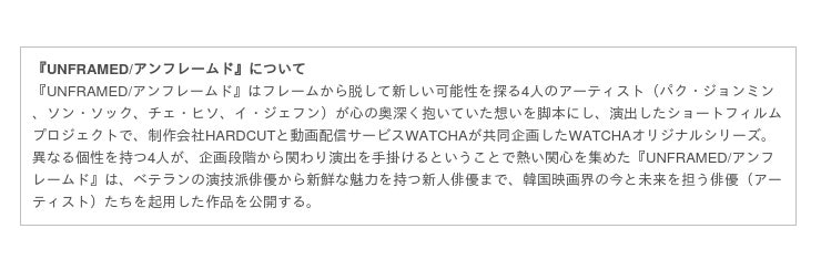 この度、株式会社Watcha Japan(本社:東京都千代田区、代表取締役兼CEO:黒田 淳一)は、映画好きのための月額動画配信サービス「WATCHA(ウォッチャ)」と韓国の制作会社HARDCUTが共同企画したオリジナルショートフィルムプロジェクト『UNFRAMED/アンフレームド』の4作品を、12月22日(水)より一挙独占配信開始いたします。また、併せて日本版ポスタービジュアルとティーザー予告編を発表いたします。