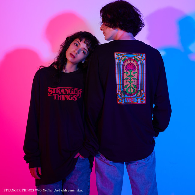 フロントには「STRANGER THINGS」のロゴ、バックにはシーズン4の象徴的なステンドグラスをプリント。