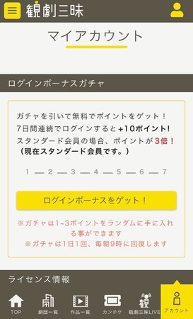 「観劇三昧」のサイトにログインしていただき、「マイアカウント」のページよりログインボーナスを獲得することができます。一日一回ガチャを引くことができ、1〜3ポイントをランダムに獲得できます。スタンダード会員は3倍のポイントを獲得できます。フリー会員・スタンダード会員ともに7日連続ログインした場合は10ポイントが追加で付与されます。無料でポイントを獲得できるため、フリー会員の方でも「観劇三昧」をお得にご利用できるチャンスが生まれます。