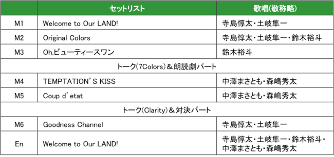 Clarityのライブが終わると再びトークパートへ。今度はClarityの二人がファンからの質問に答えていく形で、2部では『7Colorsにキュアされるなら誰がいいか?』『Clarity内でデュエット出来るなら誰とどんな曲を歌ってみたいか?』などの質問に次々回答。『Clarityの4人で今後やりたいことは?』という質問では、Clarityの4人で鍋をしたら…など声優陣によるキャラクターの妄想トークも飛び出すなど大いに盛り上がりました。