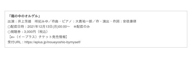 また、二人が共演した『箱の中のオルゲル』がいよいよ12月13日(月)より再配信。チケットを大好評販売中です。井上芳雄によるミュージカルの新たな試みを、ぜひご自宅でゆっくりご観劇ください。