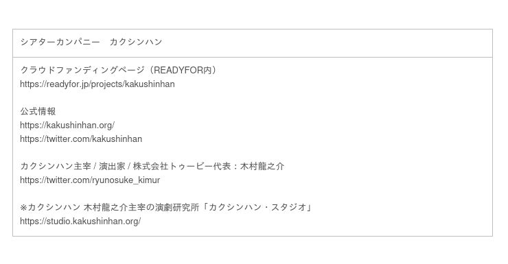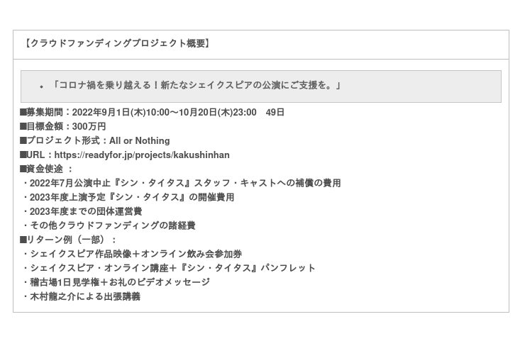 「Theatre Company カクシンハン」が新公演に向けてクラウドファンディングを開始。 - コロナ禍を乗り越える!新たなシェイクスピアの公演にご支援を。