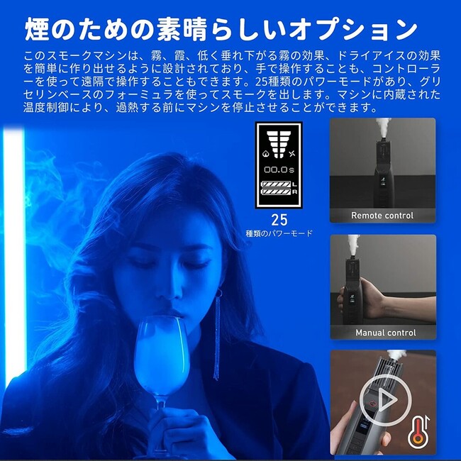 スモークマシンは、霧、霞、低く垂れ下がる霧の効果、ドライアイスの効果を簡単に作り出せるように設計されており、手で操作することも、コントローラーを使って遠隔で操作することもできます。(電池とコントローラーは別売りです)