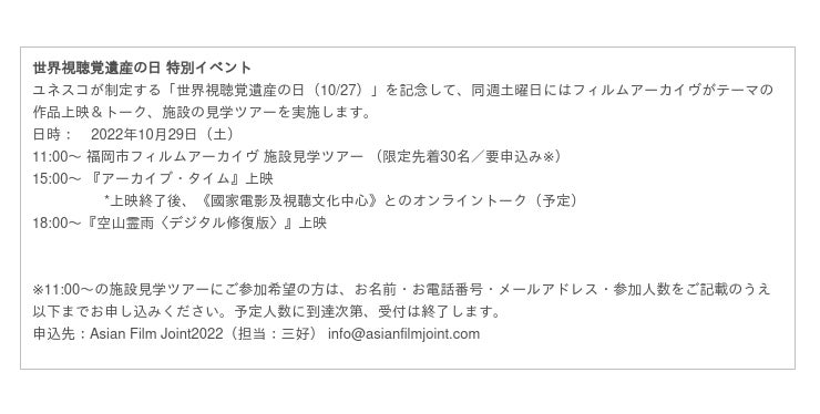 アジアフォーカス・福岡国際映画祭の上映作品を中心にアジア映画の名作を上映してきた総合図書館企画「アジア・シネマ・アンソロジー(10/10〜20)」に、Asian Film Jointが合流した特別企画を実施。Asian Film Joint2022に参加する飯岡幸子(撮影監督)と草野なつか(監督)とともに、アーカイブに収蔵された数百本のアジア作品から推薦作品を選定・上映する。充実した収蔵作品群を新たな視点から再発見し、次なる活用へ繋がっていく契機となることを目指す。来場者には会場限定で各者書き下ろしの推薦コメントを配布予定。
