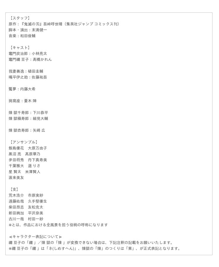 「週刊少年ジャンプ」にて2020年5月まで連載していた吾峠呼世晴による漫画『鬼滅の刃』を舞台化した作品。2020年にシリーズ1作目が上演、2021年8月に続編の舞台「鬼滅の刃」其ノ弐 絆が上演された。作品の世界観に寄り添う音楽や剣戟アクションが話題となった。