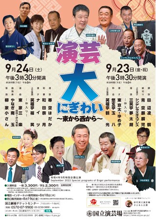 独立行政法人日本芸術文化振興会主催、令和4年9月特別企画公演『演芸大にぎわい〜東から西から〜』が2022年9月23日(金・祝)〜24日(土)に国立演芸場(東京都千代田区隼町4-1)にて開催されます。 チケットはカンフェティ(運営:ロングランプランニング株式会社、東京都新宿区、代表取締役:榑松 大剛)にて9月6日(火)19:00より発売開始です。