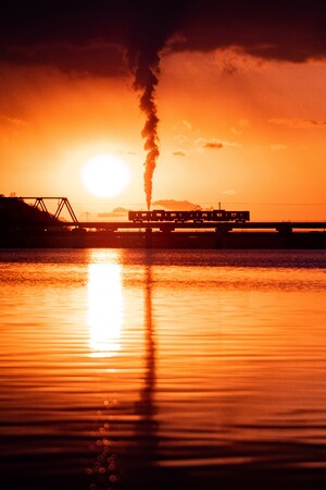 煙と太陽と列車が織りなす強烈なインパクト。通勤電車がまるで蒸気機関車のように見えます。見れば見るほどに引き込まれる不思議な作品です。それでいて、どこか懐かしさを引き起こす、心にひびく情景…。参りました。全てが合致した、一瞬の風景はまさに「写真でしか味わえない感動」です。