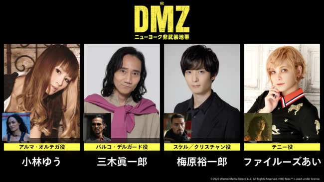 本作の日本語吹替版には、主人公アルマを『進撃の巨人』のサシャ・ブラウス役の小林ゆうが務めるほか、DMZを力で支配するギャング・パルマ役に三木眞一郎、パルマの部下として暗躍する殺し屋スケル役に梅原裕一郎、謎多き女性シンガーのテニー役にファイルーズあい、といった豪華声優陣が出演します。この度、日本語吹き替えを務めた4名の吹替声優から、本作の見どころや演じる各キャラクターに関してコメントが到着しました。