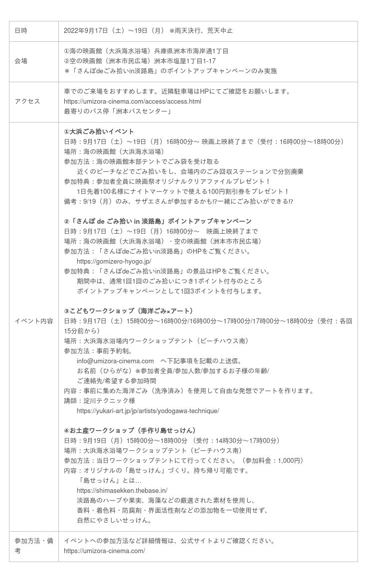 ひょうご瀬戸内ごみゼロ青年団実行委員会は、2022年9月17日(土)〜19日(月・祝)、海上スクリーンで映画を楽しむ『うみぞら映画祭2022』と連携し、会場内でのごみ拾いイベントを開催します。その他、ごみ拾いをすることでポイントが貯まり、景品と交換できる「さんぽdeごみ拾いin淡路島」のポイントアップキャンペーンや海洋ごみ問題に取り組む各種ワークショップを実施予定です。 本イベントは、日本財団が推進する海洋ごみ対策プロジェクト「海と日本プロジェクト・CHANGE FOR THE BLUE」の一環で開催するものです。