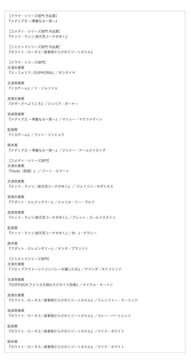 第74回エミー賞発表!作品賞に『メディア王 〜華麗なる一族〜』『ホワイト・ロータス / 諸事情だらけのリゾートホテル』が輝くほか、『イカゲーム』がアジア初の受賞で歴史的快挙。受賞作品&受賞者一覧
