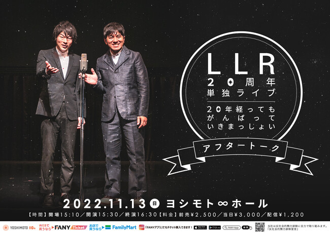 この結成を記念し、LLR20周年単独ライブ「20年経ってもがんばっていきまっしょい」、そして【アフタートーク】を、11月13日(日)、ヨシモト∞ホールにて開催することが決定しました。チケットは、本日より先行販売受付を開始します。