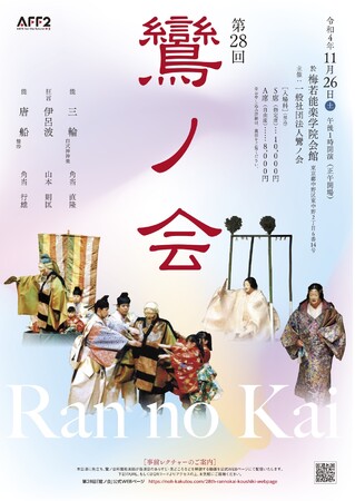 一般社団法人鸞ノ会主催『第28回鸞ノ会』が2022年11月26日 (土)に梅若能楽学院会館(東京都中野区東中野2-6-14)にて開催されます。 チケットはカンフェティ(運営:ロングランプランニング株式会社、東京都新宿区、代表取締役:榑松 大剛)にて9月15日(木)0:00より発売開始です。