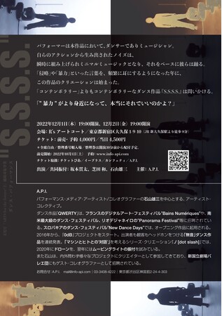アーティスト・コレクティブ "A.P.I." は、2022 年 12 月、パフォーマンス・メディア・アーティスト/振付家・ 石山雄三の新作ダンス・パフォーマンス『S.S.S.S.』を、「R's アートコート」(新大久保)で発表する。