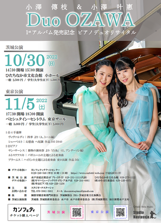 1stアルバム発売記念公演『Duo OZAWAピアノリサイタル』が2022年10月30日(日) にひたちなか市文化会館小ホール(茨城県水戸市)にて、11月5日(土)にはベヒシュタインセントラム 東京ザール(東京都千代田区)にて上演されます。チケットはカンフェティ(運営:ロングランプランニング株式会社、東京都新宿区、代表取締役:榑松 大剛)にて発売中です。
